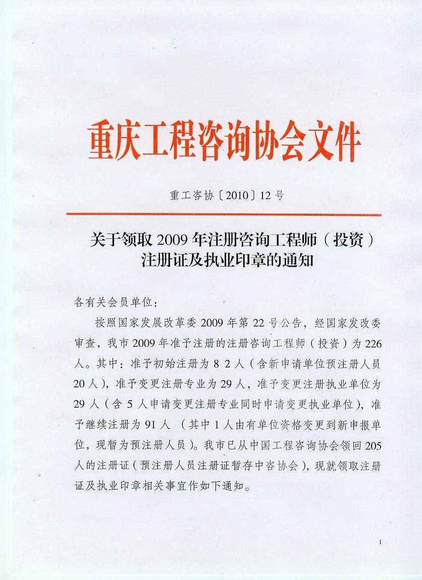 關(guān)于領(lǐng)取2009年注冊(cè)咨詢工程師(投資)注冊(cè)證及執(zhí)業(yè)印章的通知