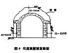 坑道式人防工程的被復(fù)方法除口部外普遍采用離壁式被復(fù)襯砌,由于地質(zhì)條件不同,有的毛洞洞壁不需要處理,有的必須進(jìn)行噴錨支護(hù)處理,但噴層與洞壁結(jié)合緊密,溫度保持在18~20℃;工程密閉段以內(nèi)的離壁空間一般都是貫通的,側(cè)墻襯砌體與洞壁間距一般為30~50厘米,頂部襯砌與洞壁的間距一般為50~100厘米(見圖四),利用這一空間來作為室外新風(fēng)冷卻降濕風(fēng)道,同樣能取得良好效果,只是很難利用自然通風(fēng),必須設(shè)置機(jī)械通風(fēng)系統(tǒng)。具體做法為:先分別確定工程的平時進(jìn)排風(fēng)口部位置,將進(jìn)風(fēng)機(jī)和降濕機(jī)室設(shè)于遠(yuǎn)離進(jìn)風(fēng)口的置,以保證進(jìn)風(fēng)氣流路徑有足夠的長度,從離壁空間進(jìn)風(fēng),部分再經(jīng)降濕機(jī)處理,混合后送入使用房間。在這樣的系統(tǒng)中,應(yīng)將進(jìn)風(fēng)孔口開在防護(hù)密閉段以內(nèi),保證戰(zhàn)時的工事防護(hù),為了使室內(nèi)廢氣不混入進(jìn)風(fēng)孔口,密閉門內(nèi)通道在進(jìn)風(fēng)孔口后應(yīng)設(shè)置隔斷門。由于工事沒口部高差,很難利用自然通風(fēng),一年四季均需開啟進(jìn)排風(fēng)機(jī),運(yùn)行費(fèi)用比能利用自然通風(fēng)的情況稍有加大。有條件的工程,可選適當(dāng)位置開設(shè)一條豎井或上斜風(fēng)道,不需被復(fù),但要做防護(hù)密閉段或平戰(zhàn)轉(zhuǎn)換措施,就可以形成利用自然通風(fēng)的條件。從平戰(zhàn)結(jié)合和可持續(xù)發(fā)展的觀點(diǎn)出發(fā),建設(shè)者不妨從長計(jì)議,一次性的稍加投資,將獲得長久性的可觀回報。