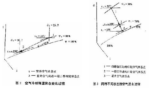 經(jīng)實(shí)測:夏季室外干球溫度33℃,相對濕度為80%時,一層工事進(jìn)風(fēng)口干球溫度為23℃,相對濕度為95%,此時空氣溫降達(dá)到10℃,空氣降濕量為9克/千克干空氣(見圖2);一層工事自然進(jìn)風(fēng)孔口平均風(fēng)速為1.4米/秒(實(shí)測值為波動值),進(jìn)風(fēng)量約為55000立方米/小時,此時總降濕量約為590公斤,相當(dāng)于LCT-25調(diào)溫降濕機(jī)22臺的降濕量,但此時的風(fēng)溫接近洞內(nèi)巖石溫度,相對濕度過大,不能直接送入室內(nèi),經(jīng)計(jì)算需再設(shè)置3臺LCT-25調(diào)溫降濕對一層工事進(jìn)風(fēng)進(jìn)行處理。每臺降濕機(jī)額定降濕風(fēng)量為6000立方米/小時,出風(fēng)溫度為38~40℃,相對濕度為30%,經(jīng)降濕機(jī)處理后的空氣與3倍額定降濕風(fēng)量的未處理的一層工事進(jìn)風(fēng)進(jìn)行混合,再送入使用房間,其送風(fēng)參數(shù):溫度為27℃,相對濕度為70%(見圖3),滿足規(guī)范要求。整套系統(tǒng)降濕機(jī)的使用量只是原三套系統(tǒng)總用量的四分之一,僅降濕機(jī)減少一項(xiàng),每小時就節(jié)電109度,每月節(jié)省開支約12500元。