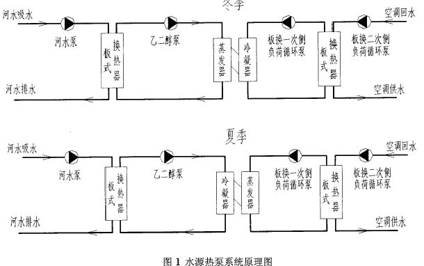 本工程水源熱泵系統(tǒng)原理圖如圖1所示。冬季,工質(zhì)通過板式換熱器從河水中吸收熱量,通過熱泵系統(tǒng)的冷凝器加熱空調(diào)系統(tǒng)的循環(huán)水,向用戶供暖。夏季工質(zhì)通過板式換熱器向河水中排出熱量,通過熱泵系統(tǒng)的蒸發(fā)器吸收空調(diào)系統(tǒng)的循環(huán)水的熱量,向用戶供冷。由于冬季江水溫度較低,為了提高換熱效果,直接利用江水和板式換熱器進(jìn)行換熱。為了得到更低的蒸發(fā)器溫度,工質(zhì)采用乙二醇溶液(加防凍劑等添加劑)。
