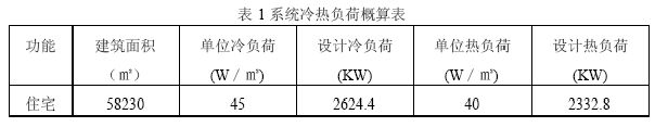 小區(qū)內(nèi)住宅設(shè)計(jì)為節(jié)能建筑,單位建筑面積的冷負(fù)荷和熱負(fù)荷分別按45W/㎡和40W/㎡進(jìn)行概算,系統(tǒng)冷熱負(fù)荷概算結(jié)果見表1。