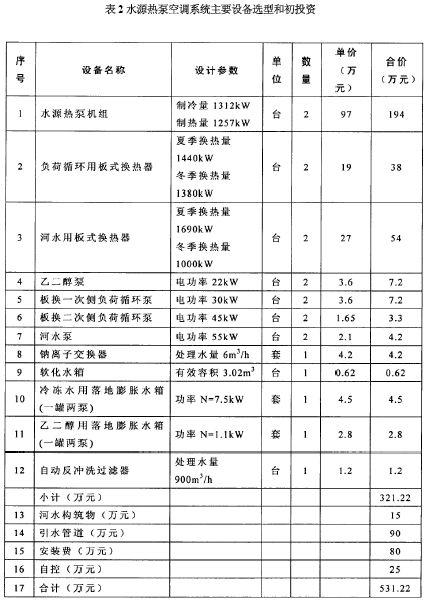 表2水源熱泵空調(diào)系統(tǒng)主要設(shè)備選型和初投資