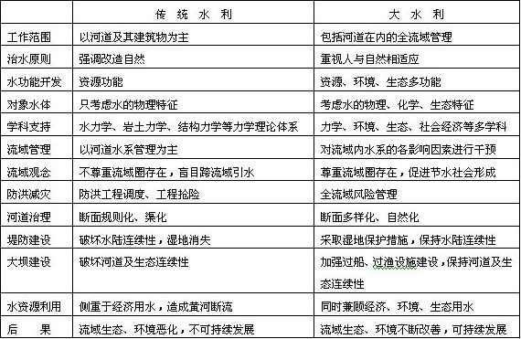 按照大水利的理論,流域規(guī)劃要全面地考慮流域的水文、自然和社會特征,即“天時”、“地利”、“人和”,以謀求流域內(nèi)社會的可持續(xù)發(fā)展為規(guī)劃目標。我在過去提出的大水利理論中曾經(jīng)對新舊水利理論的差異列表進行了比較(表2),這張表有助于我們較好地理解它們本質(zhì)上的差別。