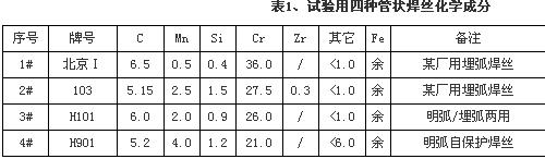RP型中速碗式磨煤機(jī)是美國(guó)CE公司60年代在傳統(tǒng)的淺碗式磨煤機(jī)的基礎(chǔ)上發(fā)展起來(lái)的專利產(chǎn)品。70年代,日本三菱公司引進(jìn)CE公司這一專利開(kāi)始制造RP碗式磨煤機(jī),銷往中國(guó)和其他國(guó)家[1].這種磨煤機(jī)的特點(diǎn)之一是采用堆焊式磨煤輥由于這種磨煤輥可反復(fù)修復(fù)使用,具有較高的經(jīng)濟(jì)性。美國(guó)和日本均很重視發(fā)展其制造及修復(fù)技術(shù),不斷從結(jié)構(gòu)和耐磨材料兩方面來(lái)提高磨煤輥的壽命。在結(jié)構(gòu)上,主要是通過(guò)增大耐磨材料的體積,發(fā)展大尺寸磨煤輥和改進(jìn)錐型磨煤輥為輪胎型磨煤輥兩種途徑來(lái)提高壽命。在材料方面,美國(guó)早期發(fā)展的標(biāo)準(zhǔn)NI-HARD用在磨煤輥上壽命僅4,000小時(shí);70年代到80年代,日本三菱公司成功發(fā)展了高鉻高碳合金鑄鐵堆焊材料,把磨煤輥壽命提高到6,000小時(shí),80年代美國(guó)又發(fā)展了一種新型耐磨堆焊材料,名為COMBUSTALLOY,使磨煤輥壽命進(jìn)一步提高[2]. 80年代我國(guó)也從CE公司引進(jìn)了這項(xiàng)技術(shù),在上海重型機(jī)器廠建立了RP碗式磨煤機(jī)的生產(chǎn)能力,并使用上海司太立公司的STOODY103S和STOODY911S生產(chǎn)了預(yù)保護(hù)堆焊復(fù)合的磨煤輥,在國(guó)內(nèi)得到推廣。隨著技術(shù)的成熟,其使用壽命也逐步達(dá)到90年代的8,000小時(shí)(當(dāng)煤中雜質(zhì)含量較少時(shí)),這就是國(guó)內(nèi)目前有代表性的成熟產(chǎn)品。無(wú)錫哈德瑞焊接技術(shù)有限公司現(xiàn)從美國(guó)引進(jìn)H101和H901新一代磨煤輥明弧自保護(hù)堆焊焊絲,具有優(yōu)良的工藝性和使用性能。本文將介紹這兩種焊絲的性能及使用情況。