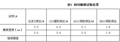 為相對(duì)比較各焊絲堆焊層的耐磨性能,請(qǐng)上海材料研究所對(duì)表1中四種焊絲的堆焊層按垂直于堆焊層平面作磨損試驗(yàn)。