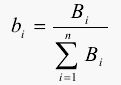 式中,n為系統(tǒng)要素總數(shù);b1為系統(tǒng)要素x1的成本系數(shù)在整個(gè)系統(tǒng)中的權(quán)重,即系統(tǒng)要素成本在系統(tǒng)成本中所占份額的大小,依此類(lèi)推。各要素成本權(quán)重一般可用其預(yù)算成本除以系統(tǒng)預(yù)算成本進(jìn)行計(jì)算,則系統(tǒng)要素xi的成本權(quán)重bi可由下式進(jìn)行計(jì)算: