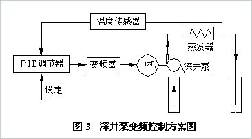 對(duì)于深井泵來(lái)說(shuō),由于深井水溫度常年保持不變,維持在18.5℃左右,我們以深井水回水溫度為控制參數(shù)即可控制井水的進(jìn)出口溫差。如圖3所示,現(xiàn)采用溫度傳感器、變頻器、PID回路調(diào)節(jié)器組成閉環(huán)控制系統(tǒng),按照5~7℃的溫差指標(biāo),深井水回水溫度控制在T℃(例如冬季12℃,夏季25℃),使深井水泵的轉(zhuǎn)速相應(yīng)于熱負(fù)載的變化而變化。以冬季為例,當(dāng)負(fù)荷增加時(shí),深井水回水溫度降低,溫度傳感器將溫度信號(hào)(4~20mA)反饋至PID回路調(diào)節(jié)器中,PID調(diào)節(jié)器根據(jù)溫度設(shè)定值和溫度反饋值的偏差進(jìn)行PID運(yùn)算,然后輸入給變頻器一個(gè)提高電機(jī)運(yùn)轉(zhuǎn)頻率的信號(hào),加大水泵轉(zhuǎn)速和流量,直到溫度與設(shè)定值一致;反之負(fù)荷降低時(shí),減小頻率,降低水泵轉(zhuǎn)速和流量。當(dāng)水泵運(yùn)行頻率降到控制儀表設(shè)定的低限值時(shí),變頻器停止頻率的繼續(xù)降低,以滿足主機(jī)對(duì)流量的要求,對(duì)主機(jī)起到保護(hù)作用。