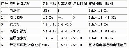 照明設(shè)備的種類很多,不同類型的照明設(shè)備、啟動(dòng)電流和啟動(dòng)時(shí)間也不一樣。此類負(fù)載使用類別為AC-5a或AC-5b.如果啟動(dòng)時(shí)間很短,可選擇其發(fā)熱電流Ith等于照明設(shè)備工作電流1.1倍。啟動(dòng)時(shí)間較長(zhǎng)以及功率因數(shù)較低,可選擇其發(fā)熱電流Ith比照明設(shè)備工作電流大一些。表2為不同照明設(shè)備用接觸器選用原則。