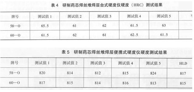 分別采用臺式硬度儀TH320、便攜式硬度儀HLN-11對研制藥芯焊絲的堆焊層進行了硬度測試,結(jié)果見表4、表5.研制藥芯焊絲堆焊層硬度平均值在61~63HRC之間,與同類產(chǎn)品相比,硬度優(yōu)勢較明顯。