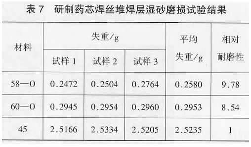 試驗表明,在較低應(yīng)力狀態(tài)下,研制藥芯焊絲堆焊層具有相當強的耐磨粒磨性能,高達45淬火鋼的8~10倍,試驗結(jié)果如表7所示。