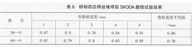 試驗表明,在較高應(yīng)力狀態(tài)下,研制藥芯焊絲堆焊層同樣表現(xiàn)出良好的耐磨粒磨損性能,試驗結(jié)果見表8。