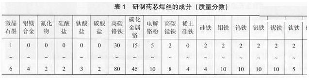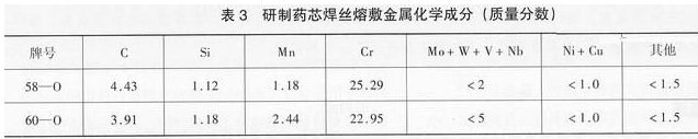 。1)藥芯焊絲采用金屬粉芯、多元合金強化型高鉻鑄鐵合金系、造氣-合金元素自保護機制。