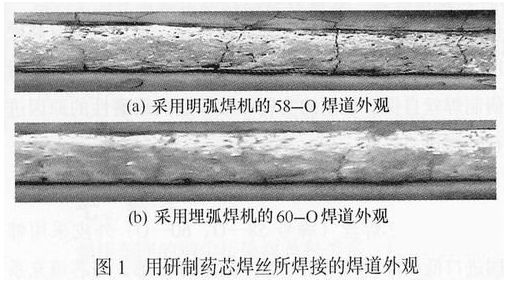 同一種自保護藥芯焊絲在相同的焊接規(guī)范下由于采用的焊接設(shè)備不同,使得焊接工藝性能差異很大。58-O適合采用ZD7-1000型逆變直流明弧自動焊機焊接;60-O適合采用MZ-1000型埋弧自動焊機不加焊劑焊接,其焊道外觀如圖1所示。
