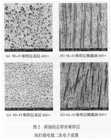 采用Quanta200型掃描電子顯微鏡對研制藥芯焊絲堆焊層表面和橫截面金相組織進行了分析,照片如圖2所示。