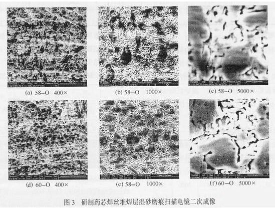 為進一步分析研制藥芯焊絲堆焊層的磨損和抗磨機理,還對濕砂試樣的磨痕進行了掃描電鏡分析,見圖3。