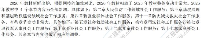 2026年初級社會工作實務(wù)考試教材(社會出版社)已下發(fā),這一版教材變動內(nèi)容有哪些呢?根據(jù)網(wǎng)校的細致對比,2026年教材相較于2025年教材整體變動非常大。