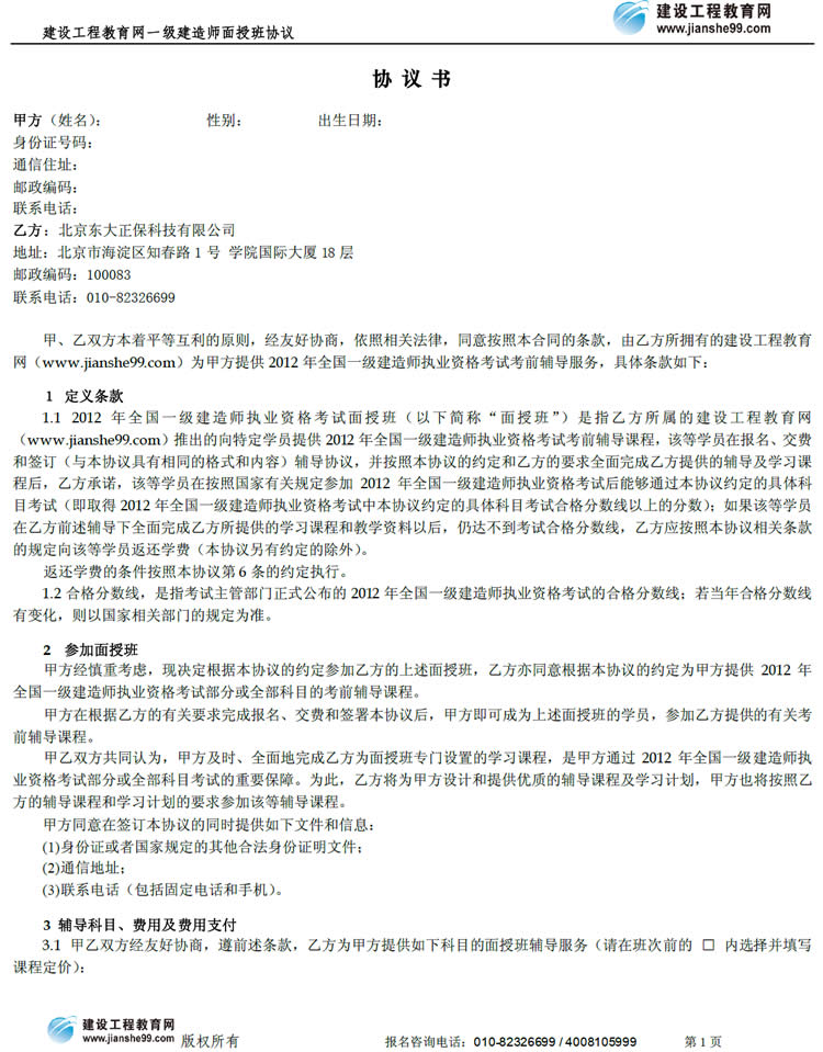 一級(jí)建造師“簽約集訓(xùn)面授班”協(xié)議書(shū)