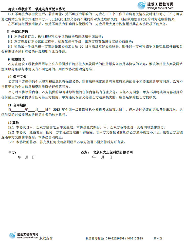 一級建造師“簽約集訓(xùn)面授班”協(xié)議書