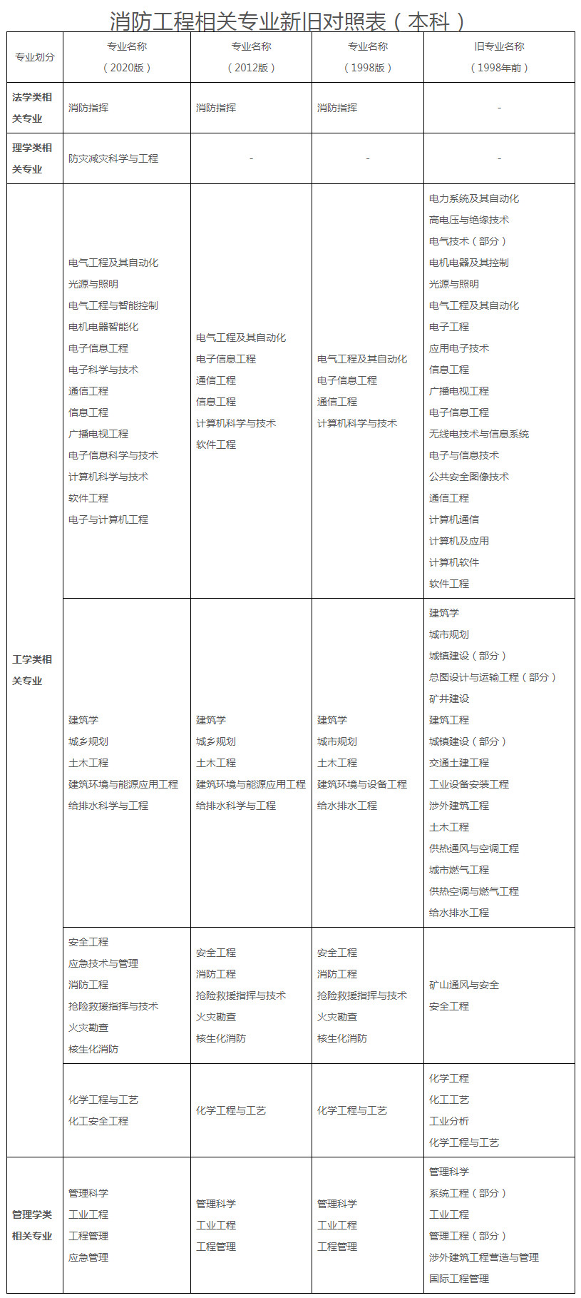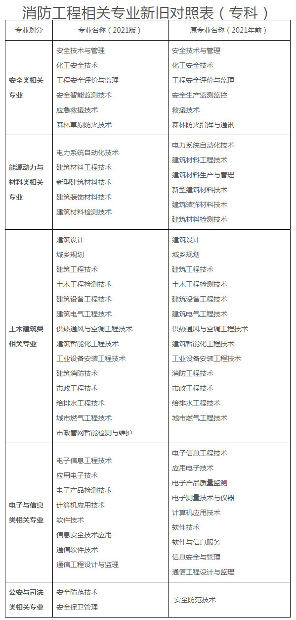 3.依據(jù)教育部最新發(fā)布的《普通高等學(xué)校本科專業(yè)目錄(2012版、2020版)》和《高等職業(yè)教育??茖I(yè)(2021版)》,應(yīng)急管理部消防救援局對(duì)《消防工程相關(guān)專業(yè)新舊對(duì)照表》增加了相關(guān)內(nèi)容,詳見(jiàn)附表。