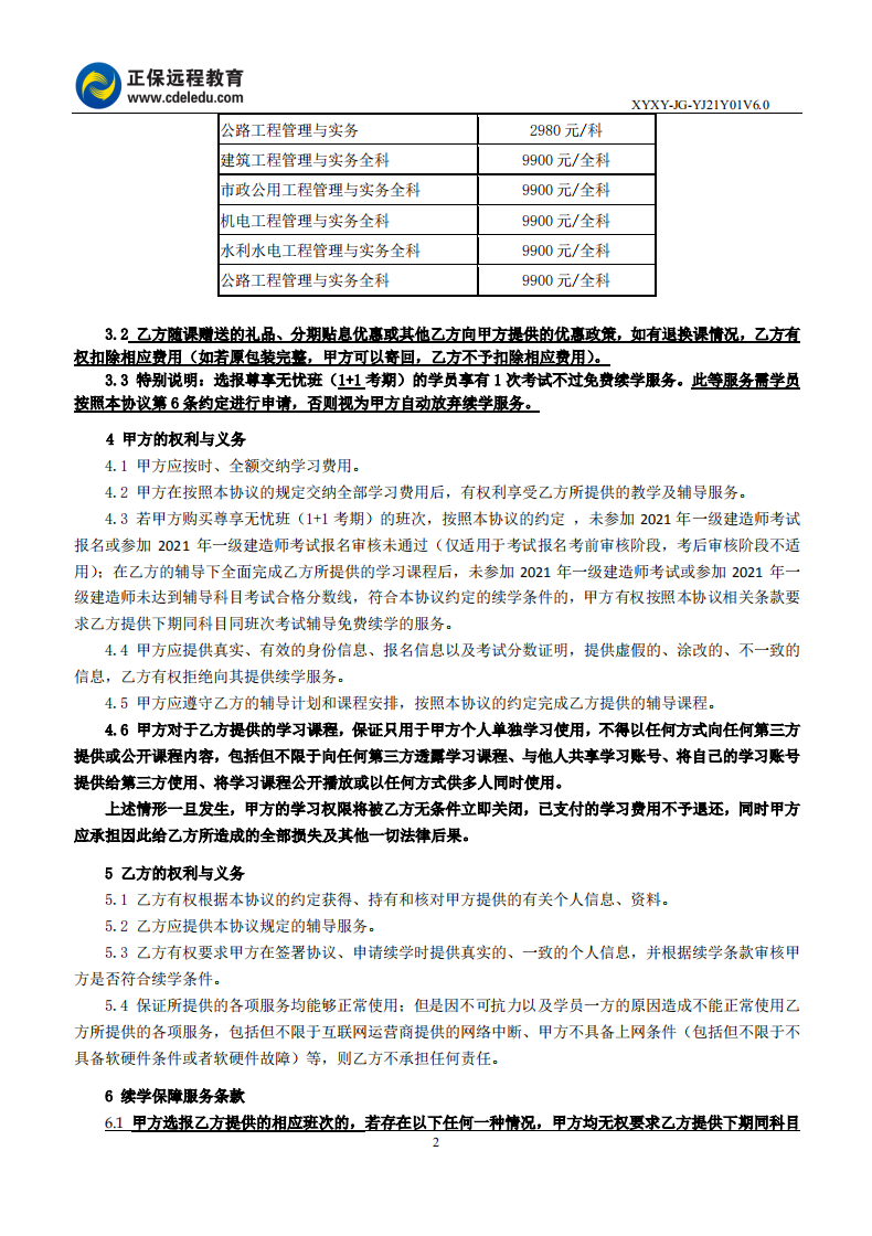 2021年一級(jí)建造師尊享無憂班續(xù)學(xué)協(xié)議書