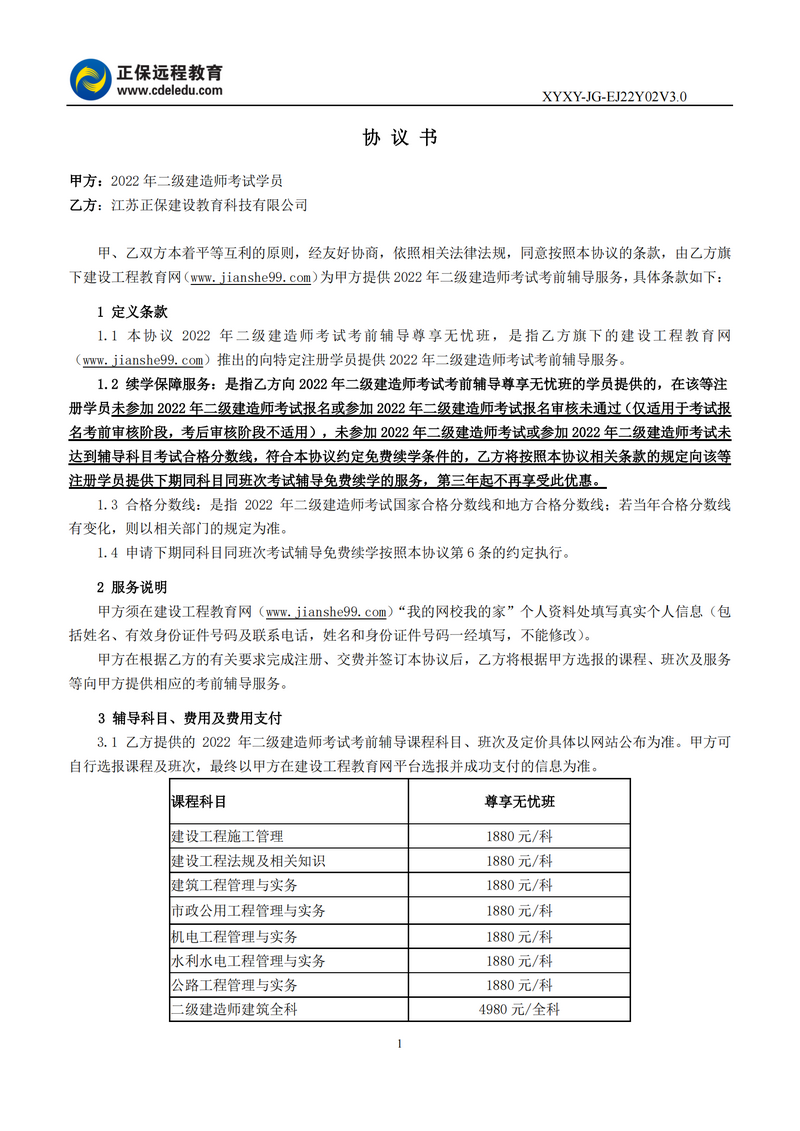 2022年二級建造師尊享無憂班協(xié)議書