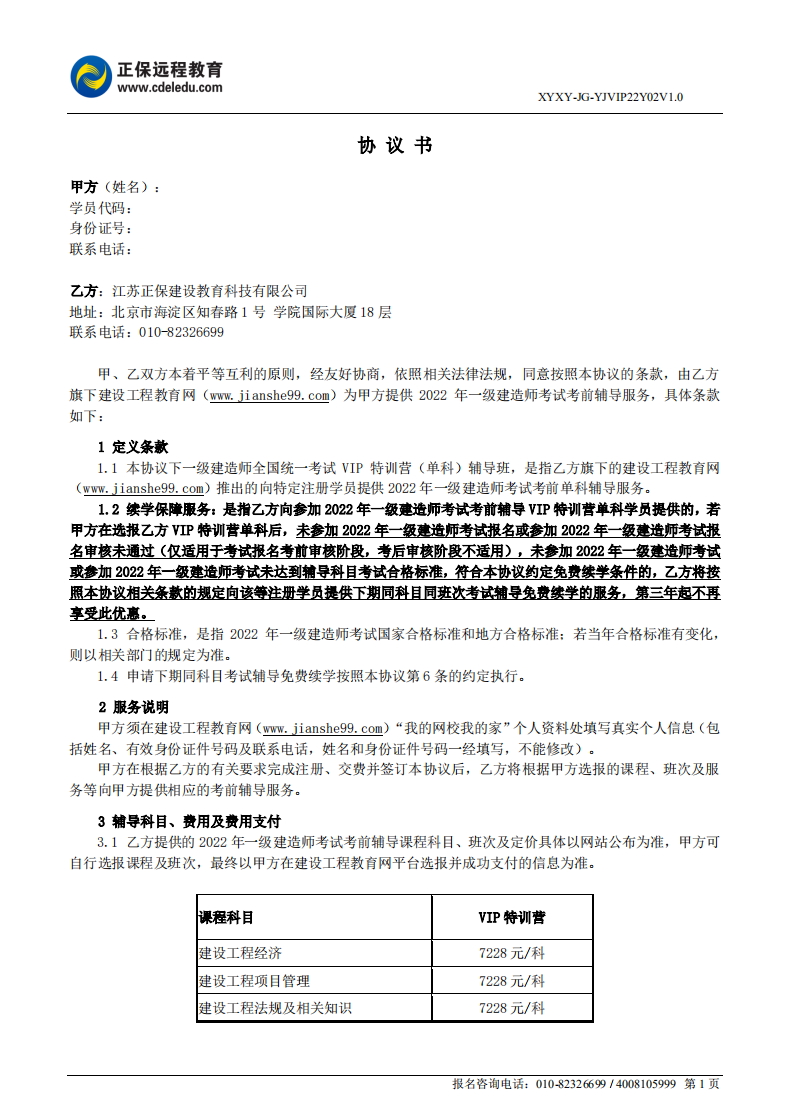 2022年一級(jí)建造師VIP特訓(xùn)營(單科)協(xié)議書