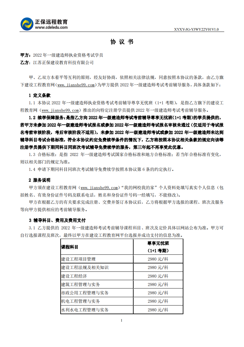 2022年一級建造師尊享無憂班續(xù)學(xué)協(xié)議書