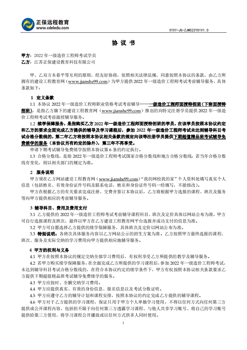 一級(jí)造價(jià)師面授特招班協(xié)議書