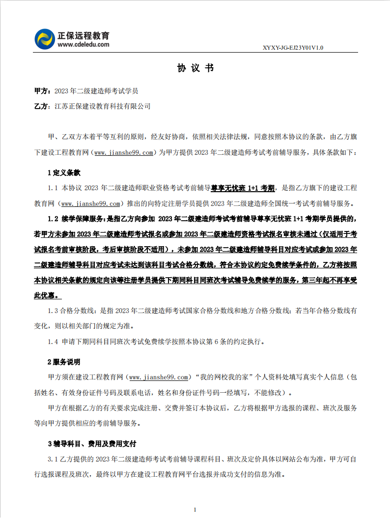2023年二級(jí)建造師尊享無(wú)憂班1+1考期協(xié)議書(shū)