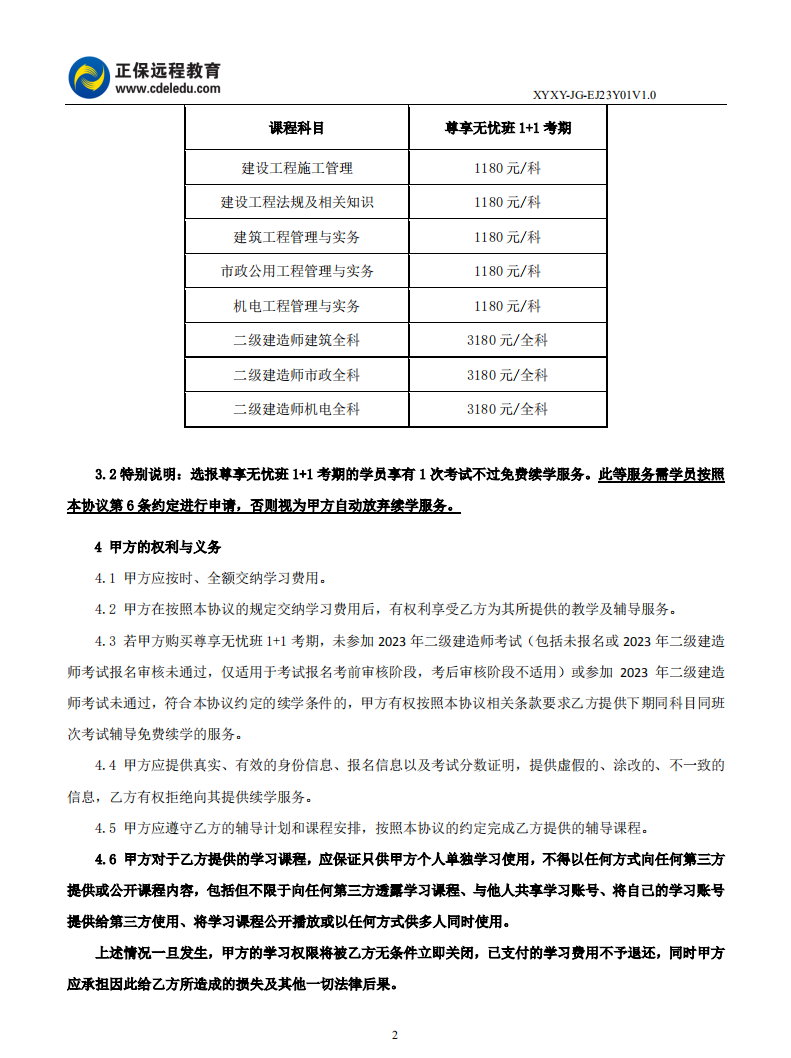 2023年二級(jí)建造師尊享無憂班1+1考期協(xié)議書