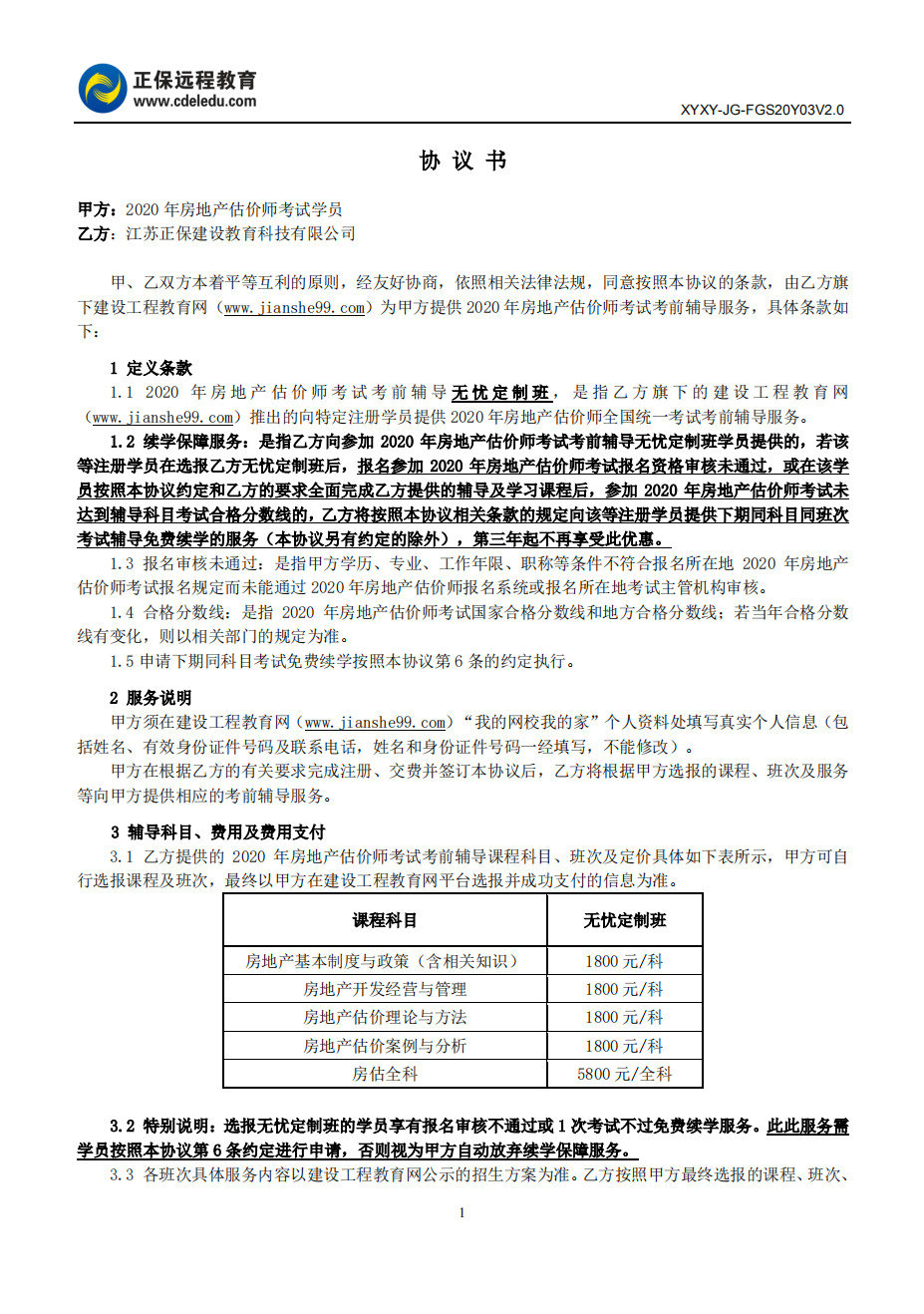 2020年房地產(chǎn)估價(jià)師無憂定制班協(xié)議書
