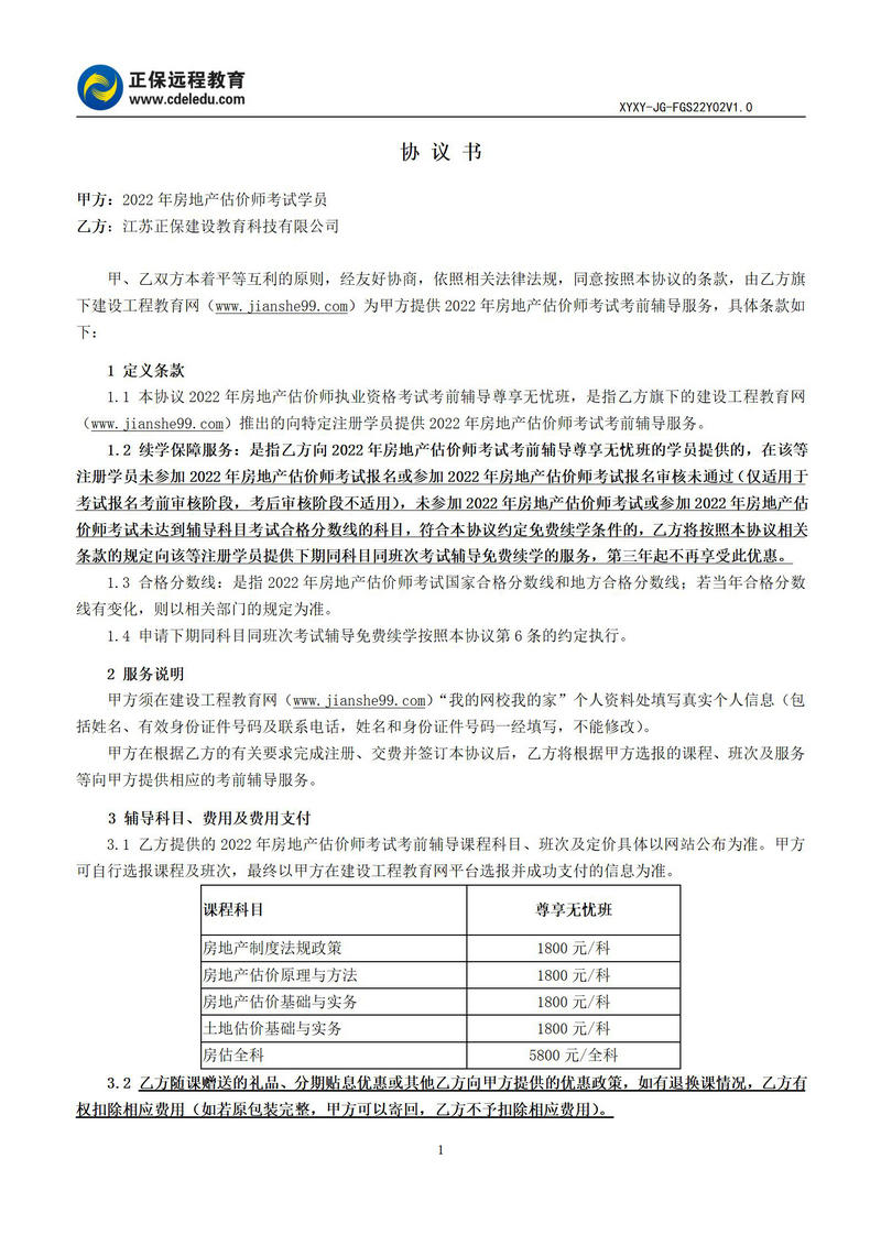 2022年房地產(chǎn)估價師尊享無憂班協(xié)議書