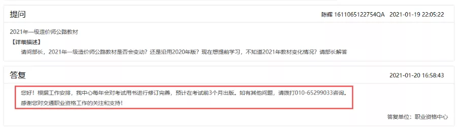 交通運(yùn)輸部回復(fù)學(xué)員問題:2021年一造公路教材的出版時(shí)間