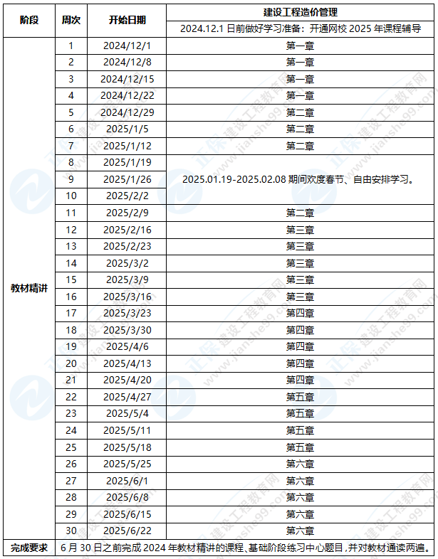 1、整體進(jìn)度說(shuō)明:本計(jì)劃表從2024年12月1日開(kāi)始執(zhí)行,計(jì)劃于2025年6月30日結(jié)束,共計(jì)30周;其中:教材精講階段安排27周,春節(jié)調(diào)整階段3周。學(xué)員可根據(jù)本表的提示,結(jié)合自己的工作,學(xué)習(xí)情況進(jìn)行細(xì)化,并按網(wǎng)校要求完成聽(tīng)課、做題的學(xué)習(xí)任務(wù),基本可滿足考試需要。
