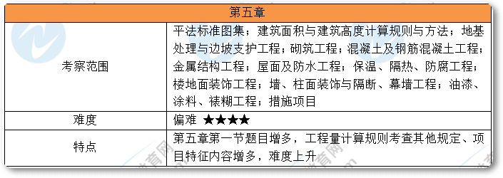 第五章第一節(jié)題目增多,工程量計算規(guī)則考查其他規(guī)定、項目特征內(nèi)容增多,難度上升。
