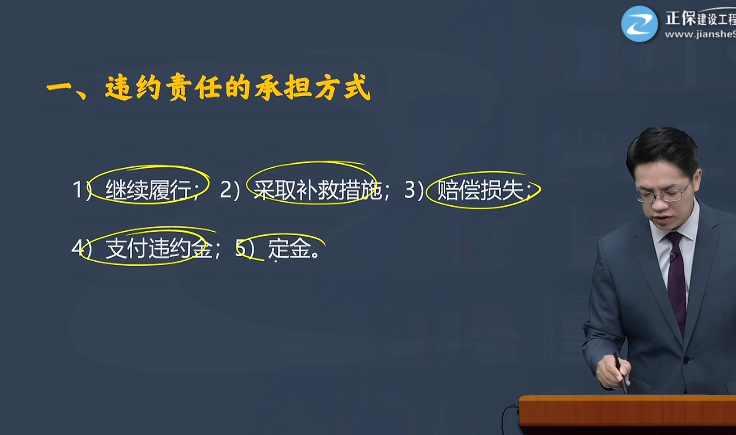 【答案解析】違約責任的承擔方式:①繼續(xù)履行。②采取補救措施。③賠償損失。④支付違約金。⑤定金。