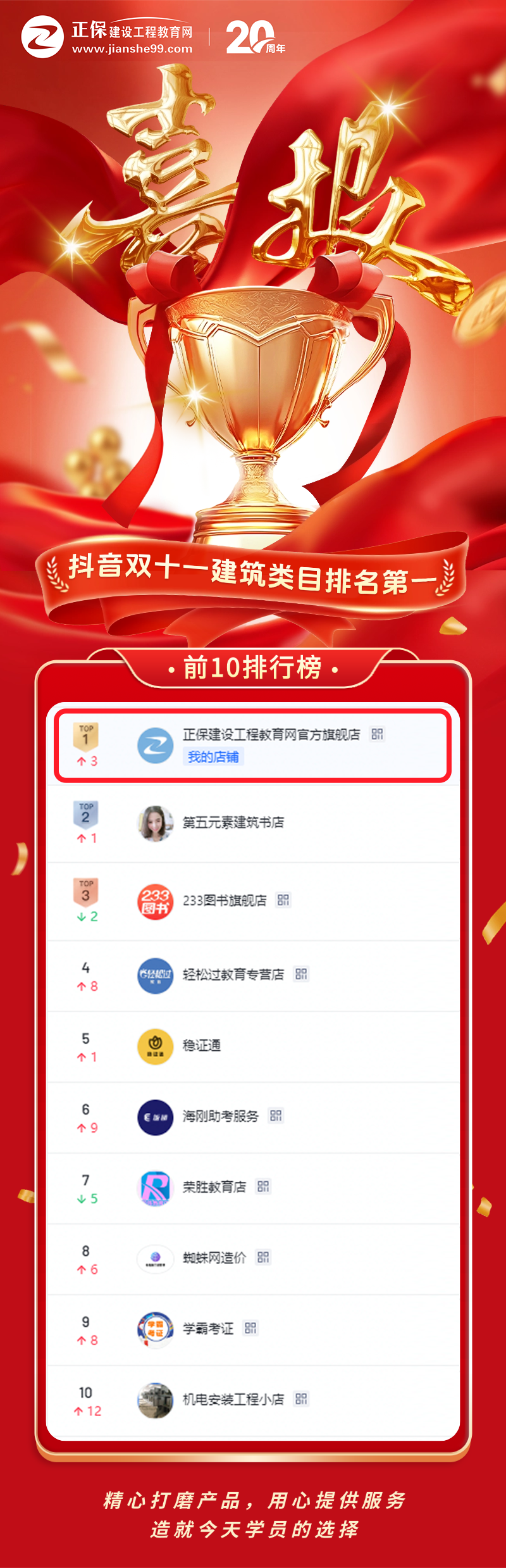抖音官方榜單新鮮出爐!在剛剛過去的爽十一大戰(zhàn)中,正保建設(shè)工程教育網(wǎng)抖音旗艦店】以絕對優(yōu)勢登頂建筑類目排行榜NO.1!這是繼“20周年”之后,我們送給全體建工學子與行業(yè)同仁的又一份硬核成績單!感謝各位同學用信任與認可,把網(wǎng)校托舉至抖音官方榜的巔峰。二十載春秋,我們始終懷揣初心,各位考生每一次下單、好評與通關(guān)拿證,都是照亮我們繼續(xù)前行的燈塔。未來,我們將以更精品的課程、更貼心的服務(wù),陪伴更多建工人把“建筑夢”照進現(xiàn)實,攜手再攀下一座行業(yè)高峰!