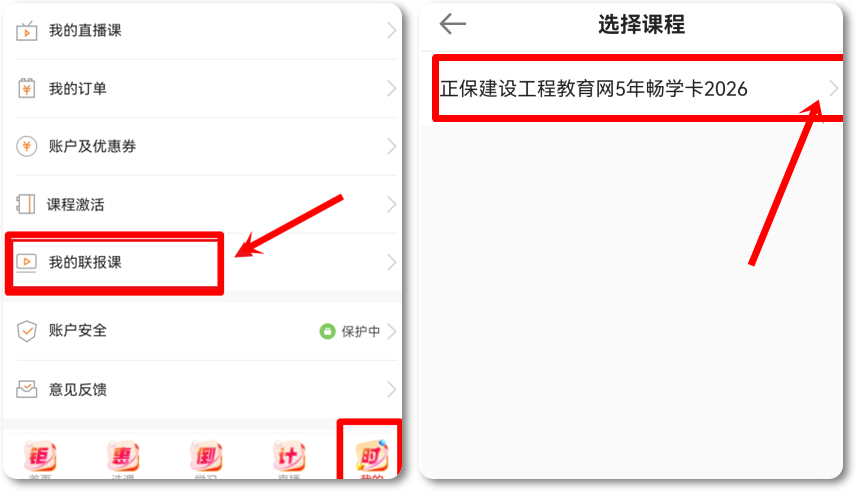 1.購(gòu)課成功后,手機(jī)端安裝“正保職業(yè)教育APP”,登錄學(xué)員代碼后,點(diǎn)擊右下角“我的”按鈕;選擇“我的聯(lián)報(bào)課”。選擇課程“5年暢學(xué)卡”。進(jìn)入開(kāi)課(APP需8.5.0及以上版本方可使用。);