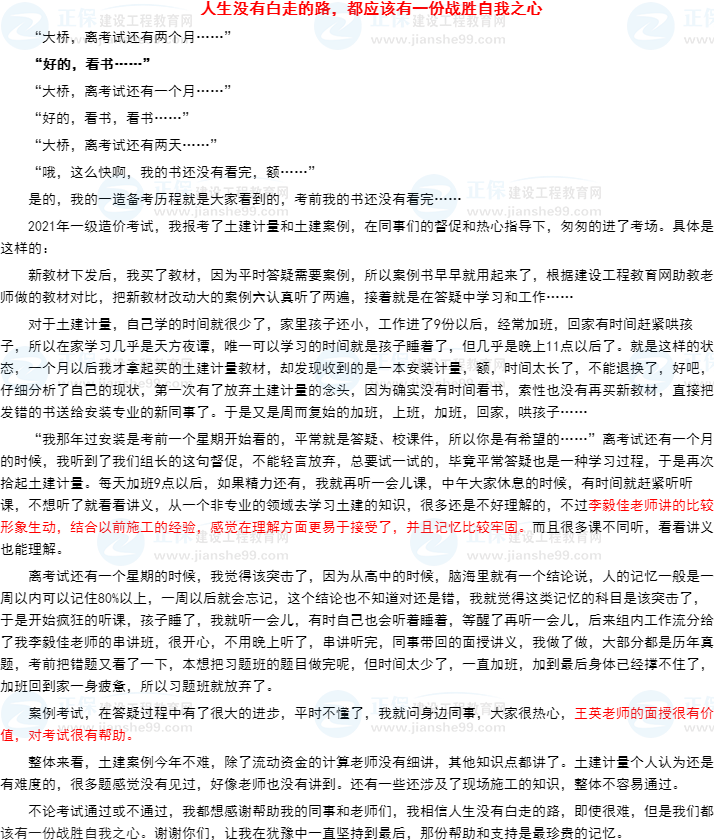 2021年一級造價師考試已經(jīng)結(jié)束,建設(shè)工程教育網(wǎng)在這個考試結(jié)束之際,推出了“我的造價備考之路”有獎?wù)魑幕顒?!你投稿我發(fā)獎,在這個考完的放松時刻,讓你說出你的備考心得,分享你的備考醫(yī)路,在此小編為大家整理參與活動的投稿內(nèi)容,一起分享大家的備考感悟與心得: