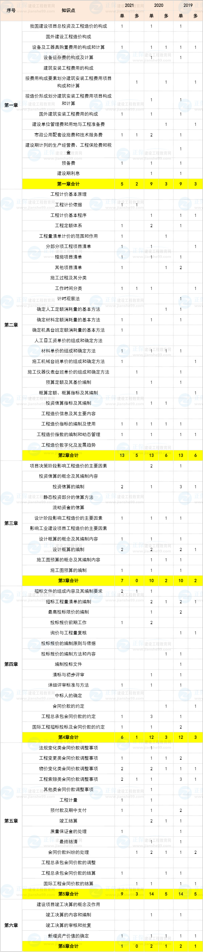 2021年一級造價師考試工程計價各章分值分布詳情