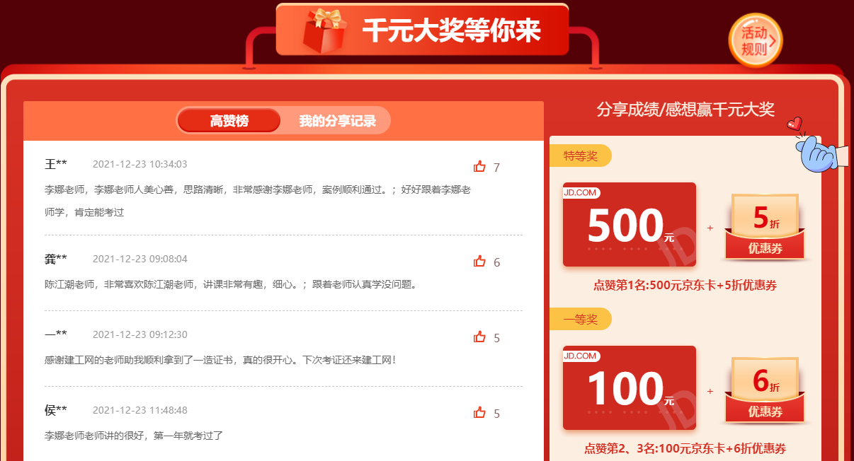 回望一年的一造備考之旅,這其中有艱辛、有汗水、有努力……,如此珍貴的備考經(jīng)驗當然應該分享出來,快來參與網(wǎng)校一造備考成績/感想,點贊最高的可獲得:500元京東卡+5折優(yōu)惠券!猛戳進入分享通道>>
