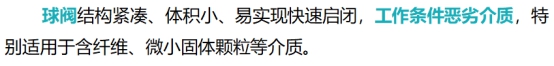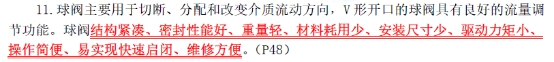 【解析】球閥在管道上主要用于切斷、分配和改變介質(zhì)流動(dòng)方向,設(shè)計(jì)成V形開口的球閥還具有良好的流量調(diào)節(jié)功能。球閥的選用特點(diǎn):適用于水、溶劑、酸和天然氣等一般工作介質(zhì),而且還適用于工作條件惡劣的介質(zhì),如氧氣、過氧化氫、甲烷和乙烯等,且適用于含纖維、微小固體顆料等介質(zhì)。參見教材P48。