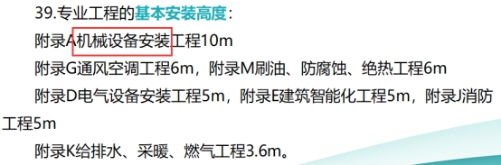 【解析】《安裝工程計(jì)量規(guī)范》中各專業(yè)工程基本安裝高度分別為:附錄A機(jī)械設(shè)備安裝工程10m,附錄D電氣設(shè)備安裝工程5m,附錄E建筑智能化工程5m,附錄G通風(fēng)空調(diào)工程6m,附錄J消防工程5m,附錄K給排水、采暖、燃?xì)夤こ?.6m,附錄M刷油、防腐蝕、絕熱工程6m。參見教材P115。