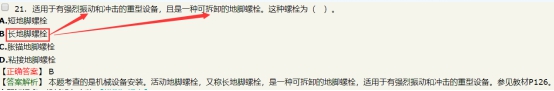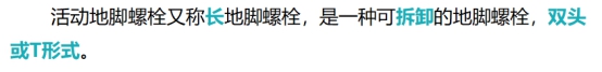 【解析】活動(dòng)地腳螺檢:又稱長地腳螺栓,是一種可拆卸的地腳螺栓,這種地腳螺栓比較長,或者是雙頭螺紋的雙頭式,或者是一頭螺紋、另一頭T字形頭的T形式。適用于有強(qiáng)烈震動(dòng)和沖擊的重型設(shè)備。參見教材P126。