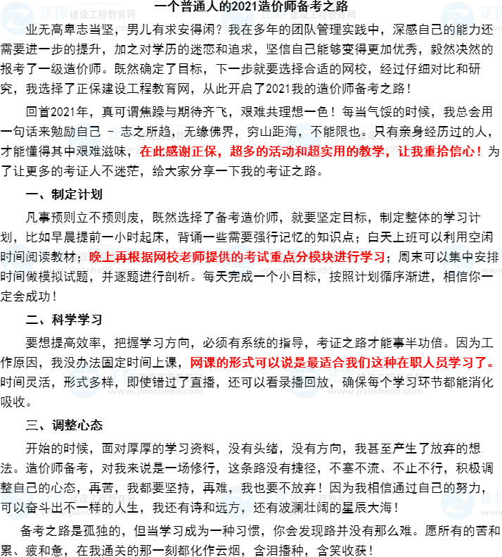 2021年一級造價師考試已經結束,建設工程教育網在這個考試結束之際,推出了“我的造價師備考之路”有獎征文活動!你投稿我發(fā)獎,在這個考完的放松時刻,讓你說出你的備考心得,分享你的備考醫(yī)路,在此小編為大家整理參與活動的投稿內容,一起分享大家的備考感悟與心得: