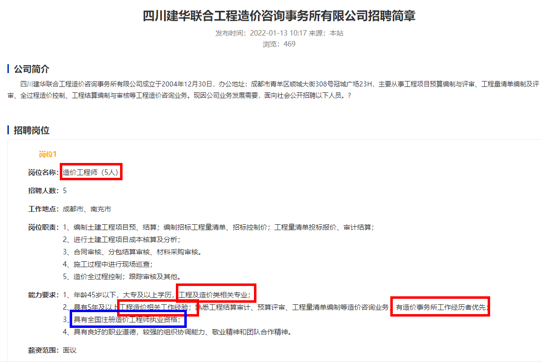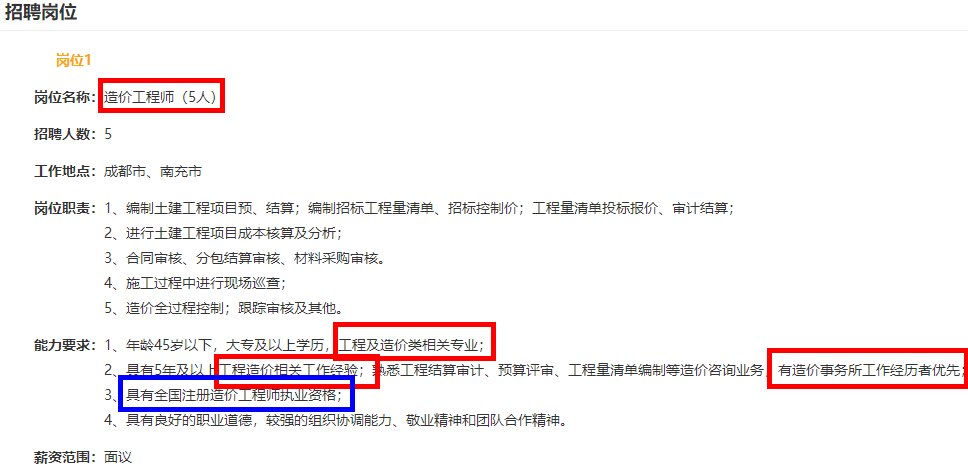 崗位名稱:造價(jià)工程師(5人)