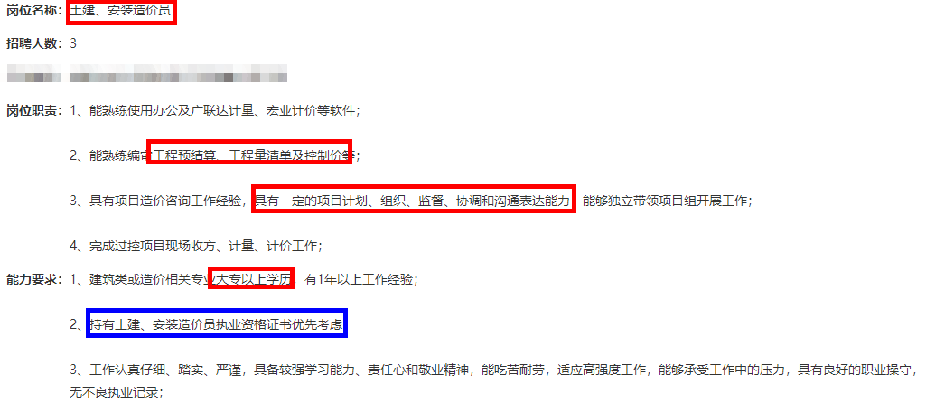 另外,很多大型企業(yè)招聘也是會優(yōu)先考慮持有證書的人員,例如下面這家公司,招聘造價(jià)員和一級造價(jià)工程師,招聘條件里就明確說明了,持有相關(guān)證書者優(yōu)先考慮,所以相關(guān)工作或者想在現(xiàn)有職位上有一定晉升的朋友,就可以考慮通過考證來改變現(xiàn)狀。