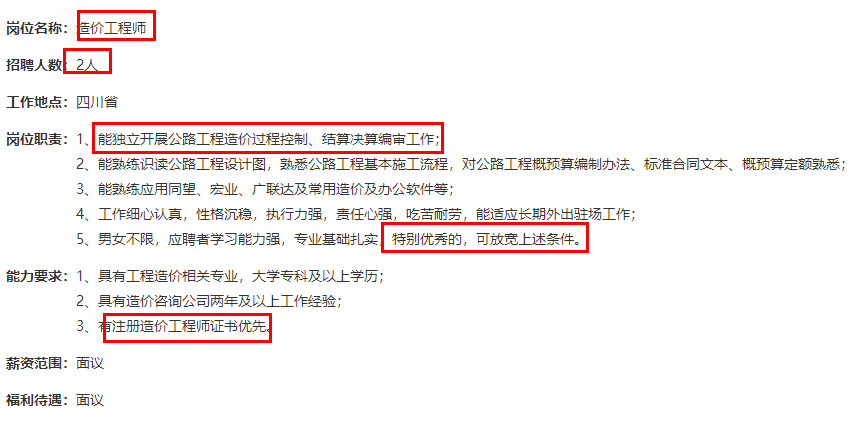 目前很多公司招聘造價(jià)工程師、項(xiàng)目經(jīng)理等職位,都是會(huì)優(yōu)先考慮有證書者,下面是某大型公司的招聘造價(jià)工程師的招聘簡(jiǎn)章,可以一起來(lái)看看!