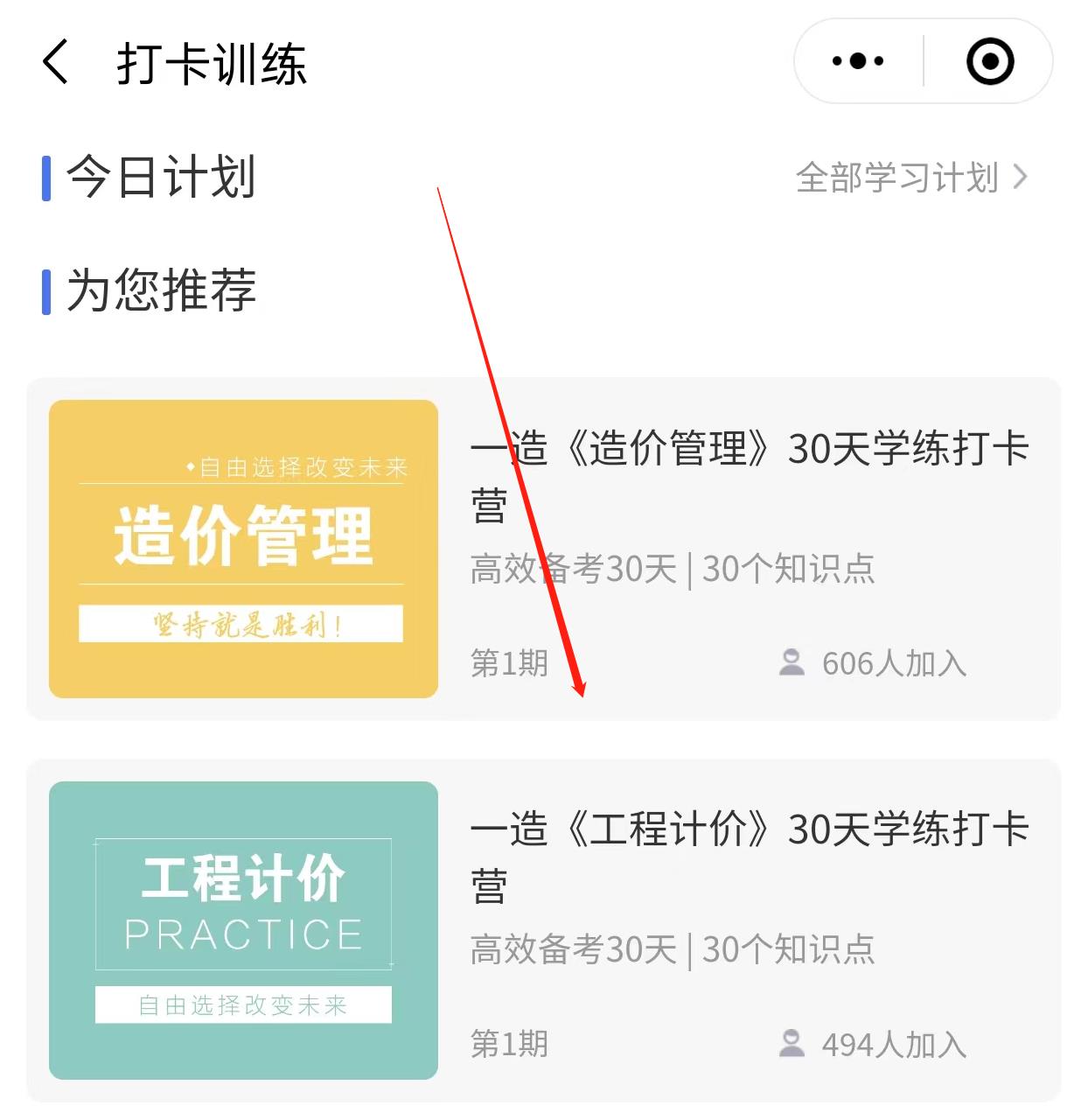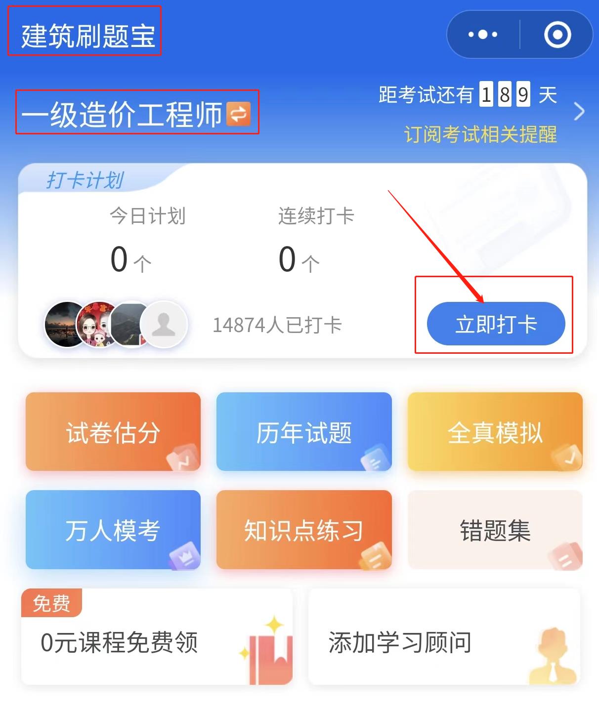 選擇一級造價師,點擊立即打卡,選擇科目即可。