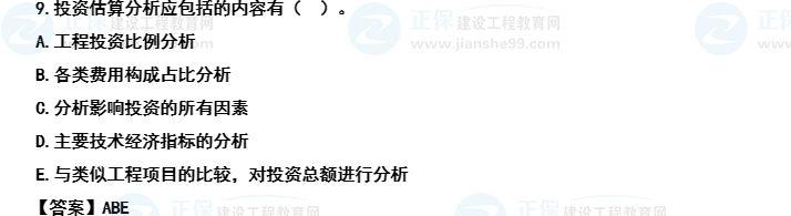 【解析】本題考查的是投資估算的概念及其編制內(nèi)容。投資估算分析包括:(1)工程投資比例分析;(2)各類費(fèi)用構(gòu)成占比分析;(3)分析影響投資的主要因素;(4)與類似工程項(xiàng)目的比較,對(duì)投資總額進(jìn)行分析。參見教材P129。